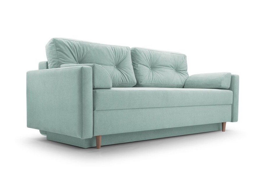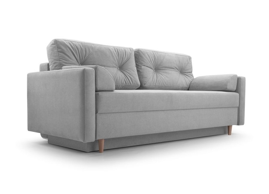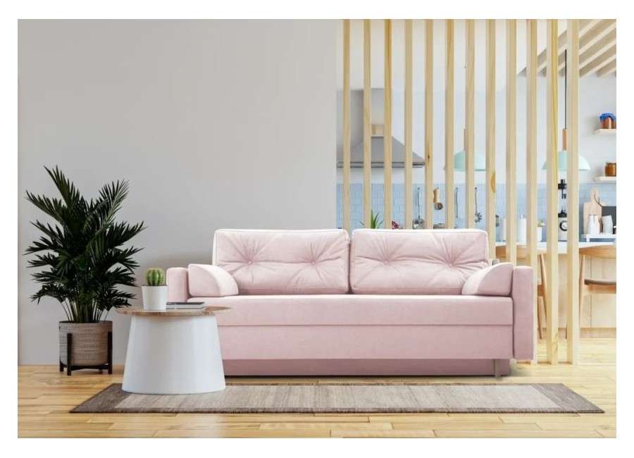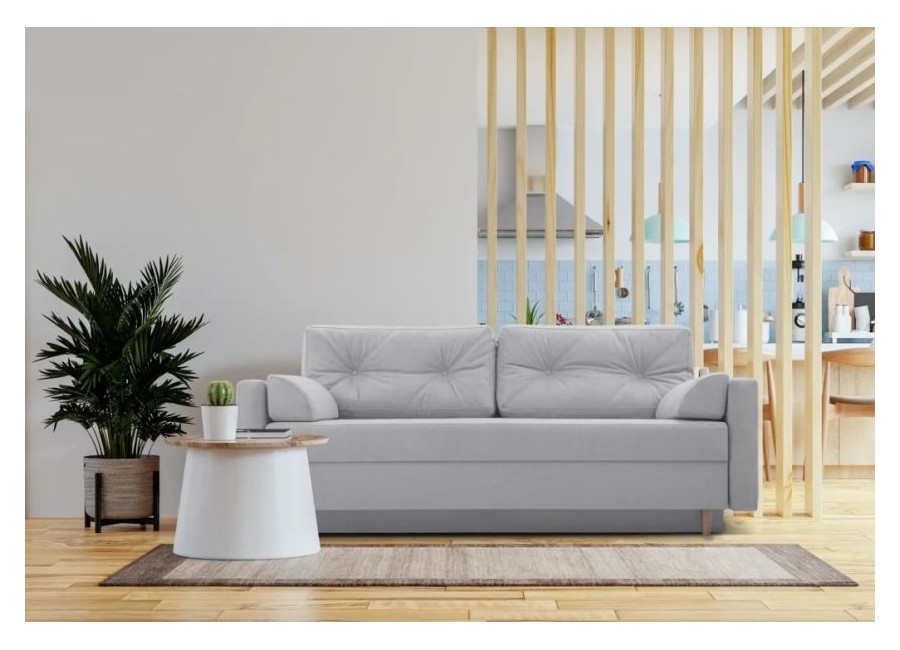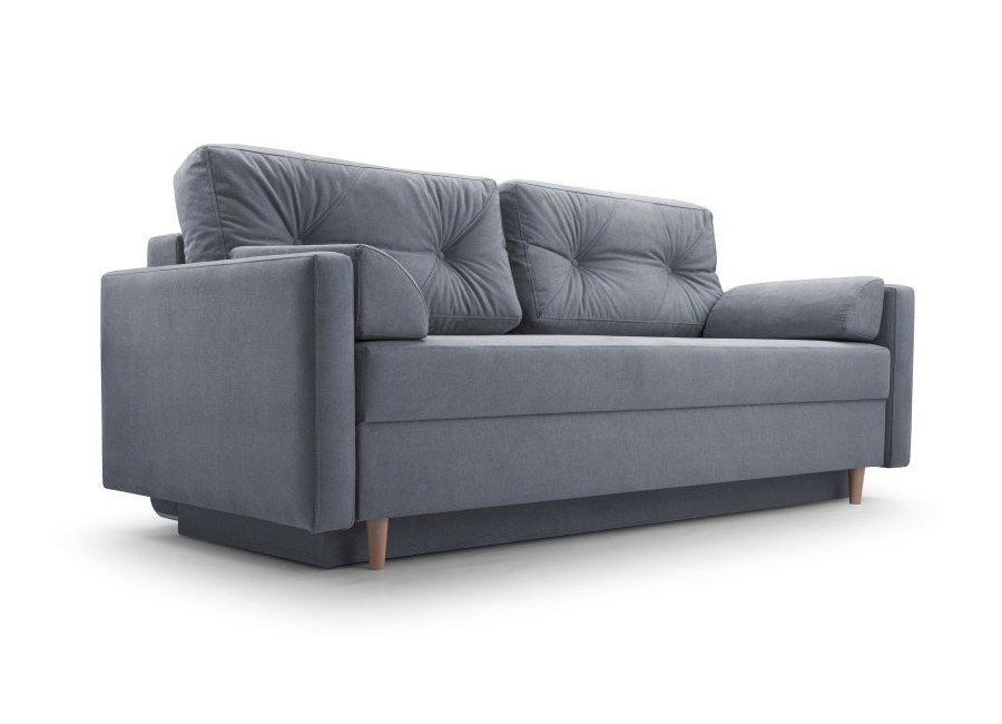 Kanapa TORI to stylowy mebel posiadający funkcję spania i pojemnik na pościel. Poduszki oparciowe są luźne. Tył kanapy obity materiałem sprawia, że może stać na środku pokoju. Nóżki drewniane.