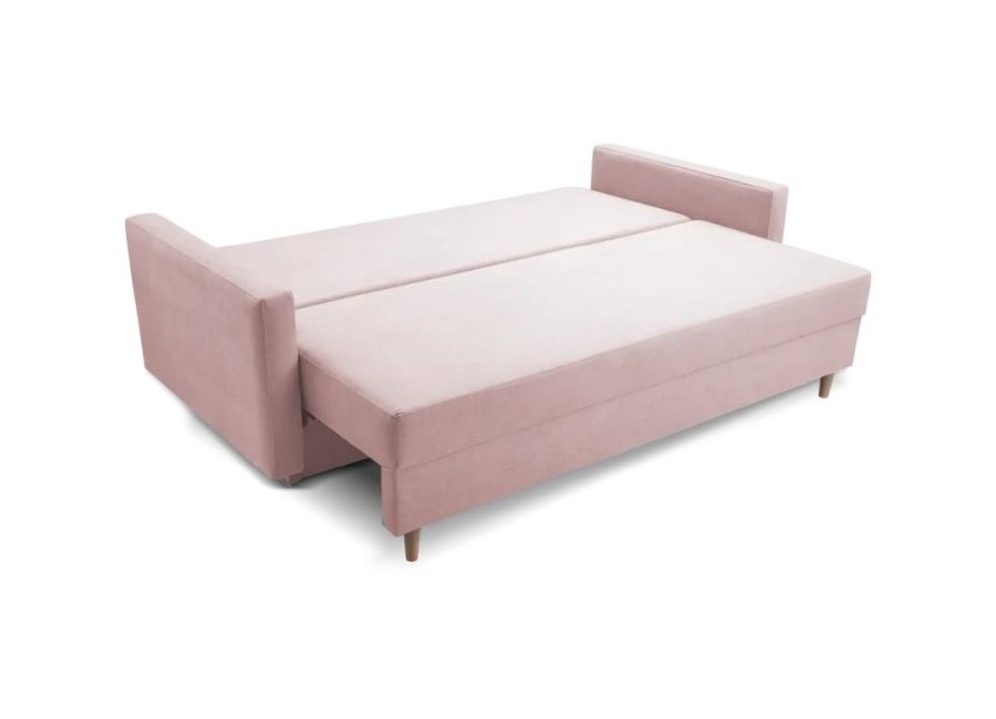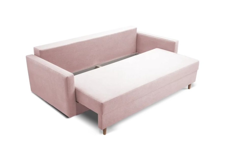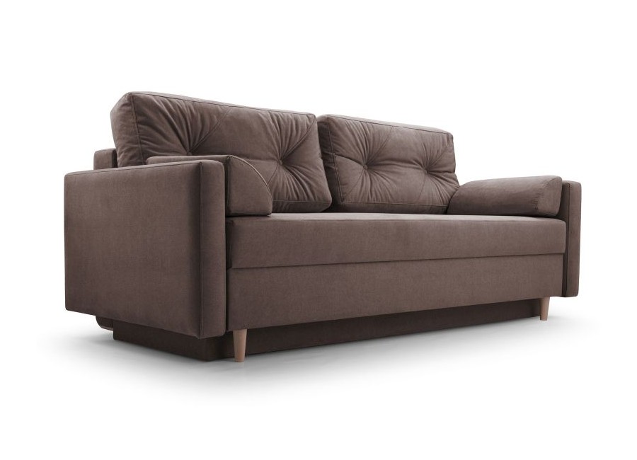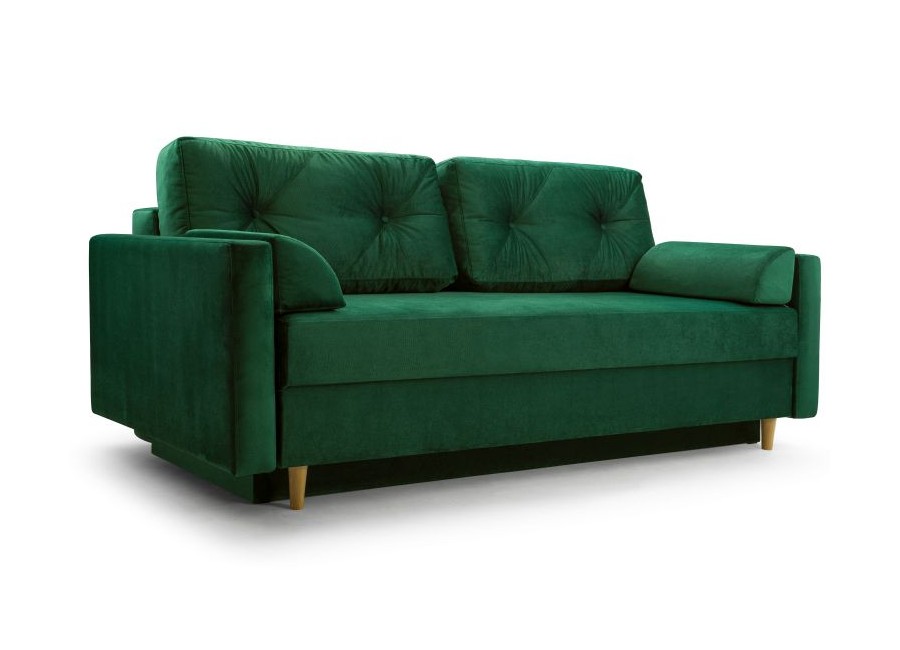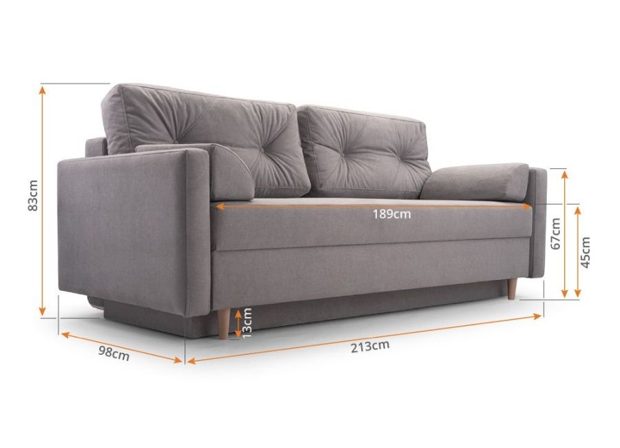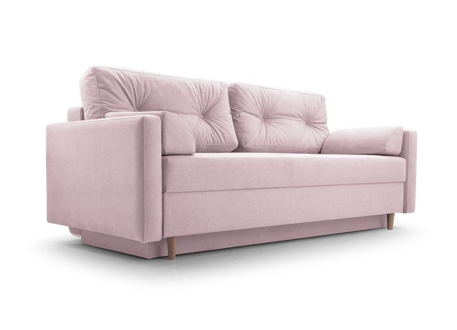 Kanapa TORI to stylowy mebel posiadający funkcję spania i pojemnik na pościel. Poduszki oparciowe są luźne. Tył kanapy obity materiałem sprawia, że może stać na środku pokoju. Nóżki drewniane.