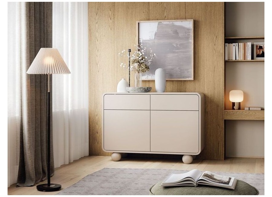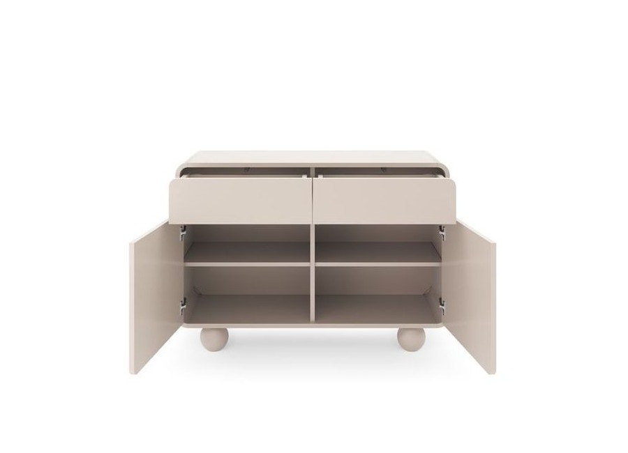 W meblach ALBION fronty otwierane są w systemie push-to-open z cichym domykiem zapewniające komfort obsługi bez konieczności stosowania uchwytów. Szuflady wysuwane są na prowadnicach kulkowych z pełnym wysuwem. Nogi w kształcie kuli.