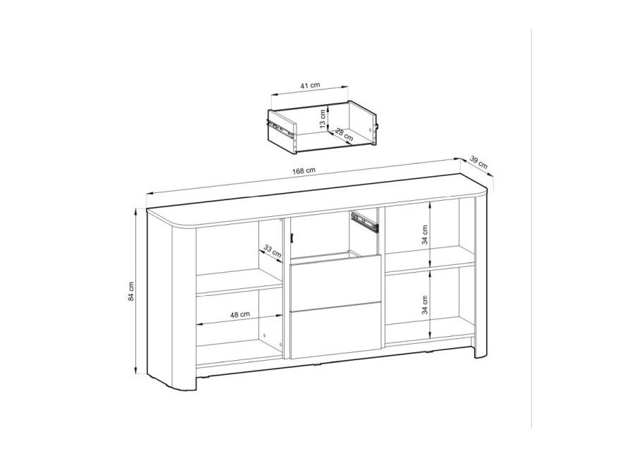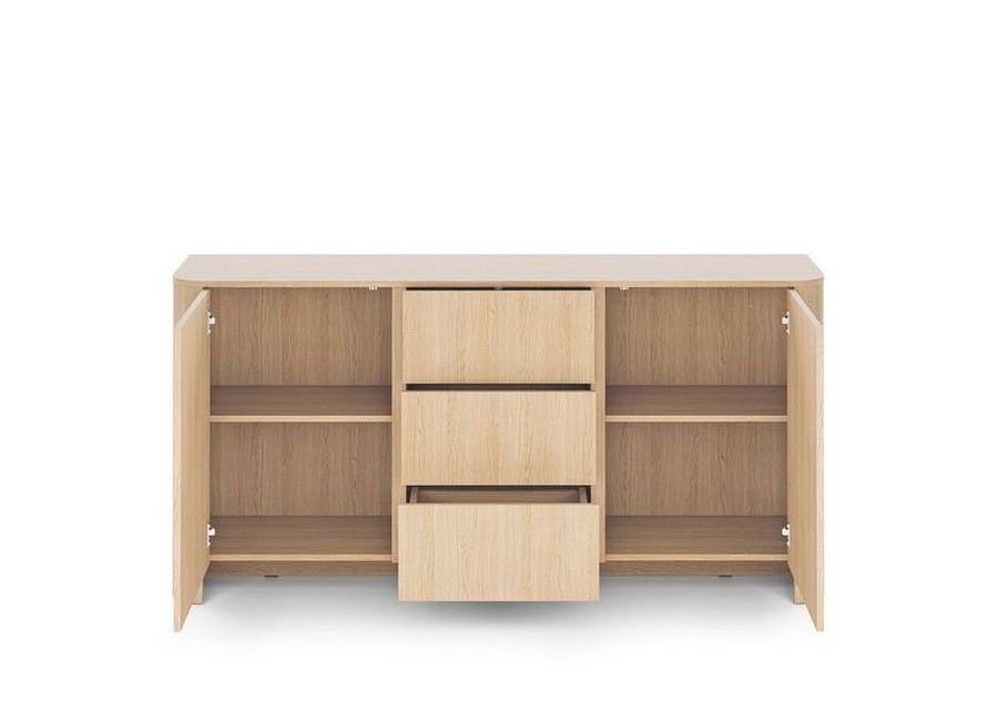 Komoda wykonana jest z płyty laminowanej o grubości 16 mm, wykończonej obrzeżem ABS.
