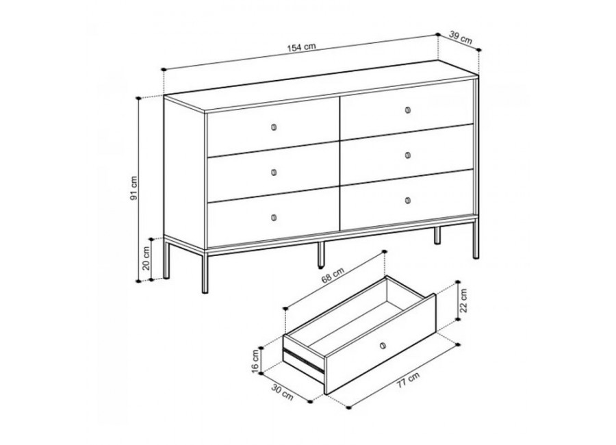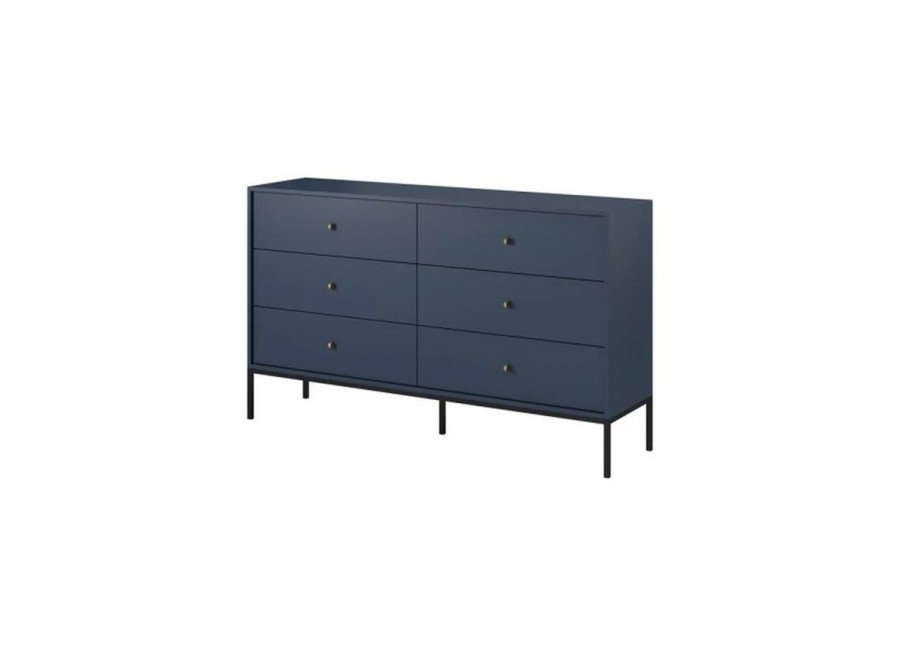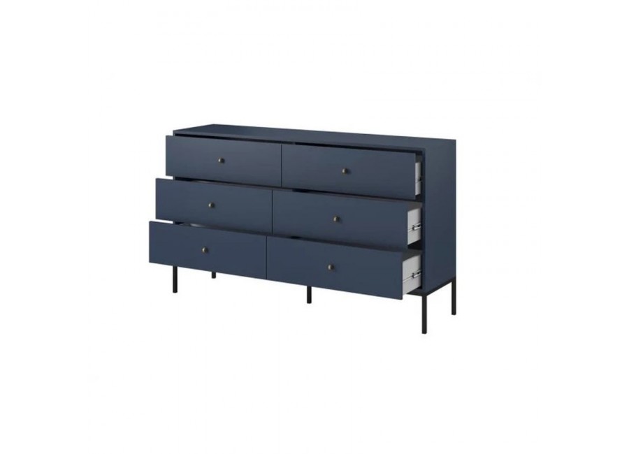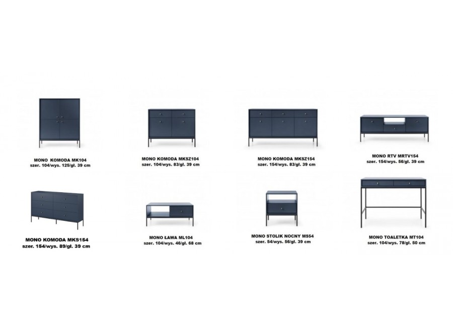 Meble systemowe w nowoczesnym kolorze granatu, uszlachetnione subtelnym złotym uchwytem. Wszystkie bryły uniesione na delikatnej czarnej podstawie.