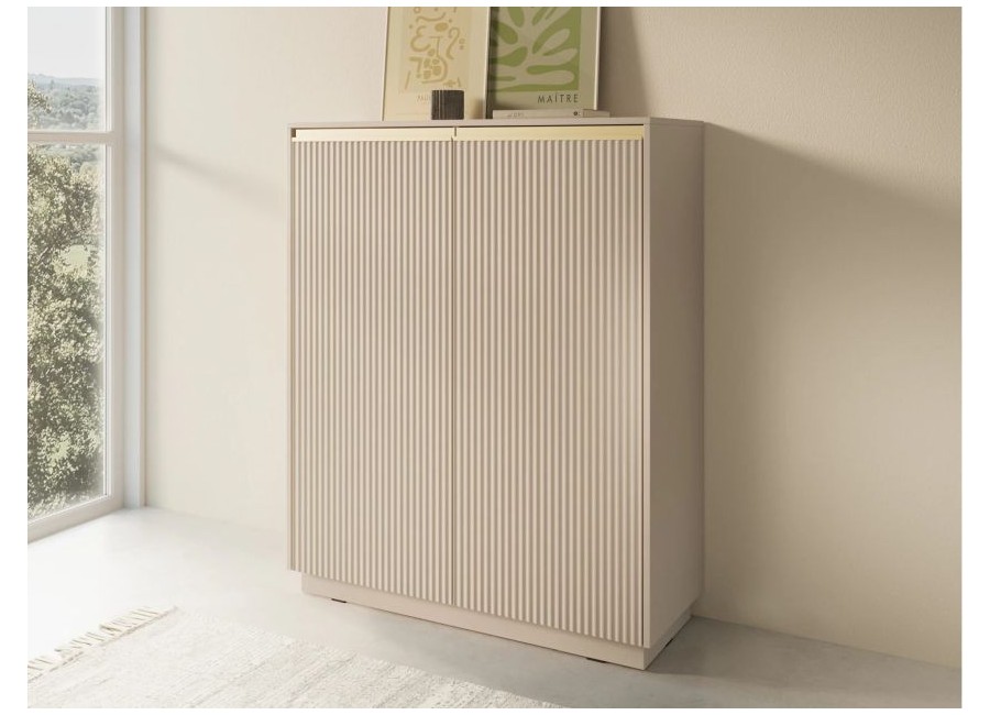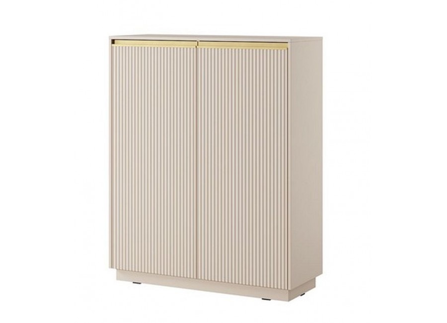 Ryflowane fronty zwieńczone złotym uchwytem są osadzone w prostokątnym korpusie i na pełnym cokole.