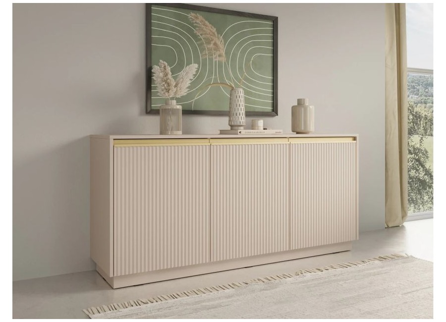 Ryflowane fronty zwieńczone złotym uchwytem są osadzone w prostokątnym korpusie i na pełnym cokole.