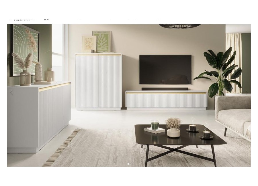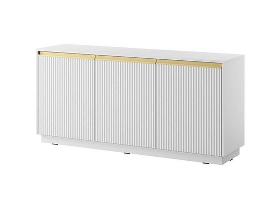 Ryflowane fronty zwieńczone złotym uchwytem są osadzone w prostokątnym korpusie i na pełnym cokole.