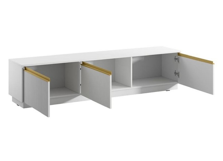 Ryflowane fronty zwieńczone złotym uchwytem są osadzone w prostokątnym korpusie i na pełnym cokole.