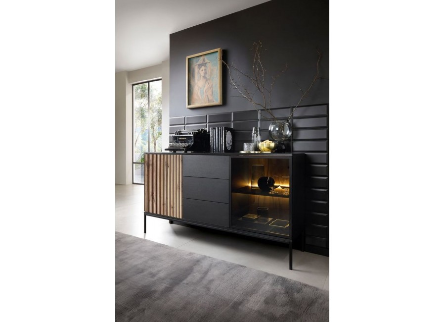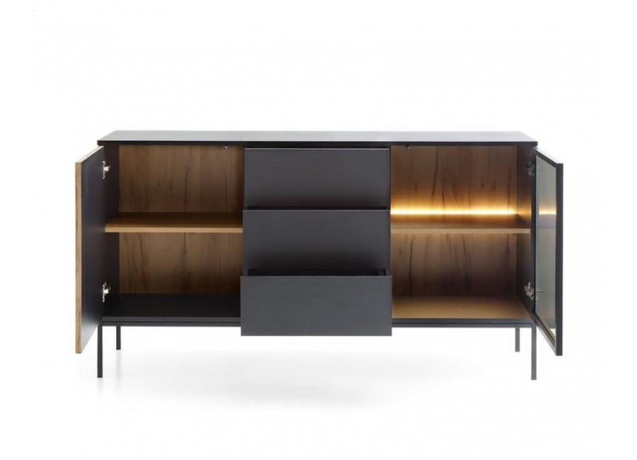 Komoda SENTO KSZ154 dąb wotan/czarny to mebel, który dzięki frezowanym frontom w ciepłym odcieniu dębu zwieńczonych ciepłą barwą oświetlenia LED tworzy nowoczesny i funkcjonalny design.