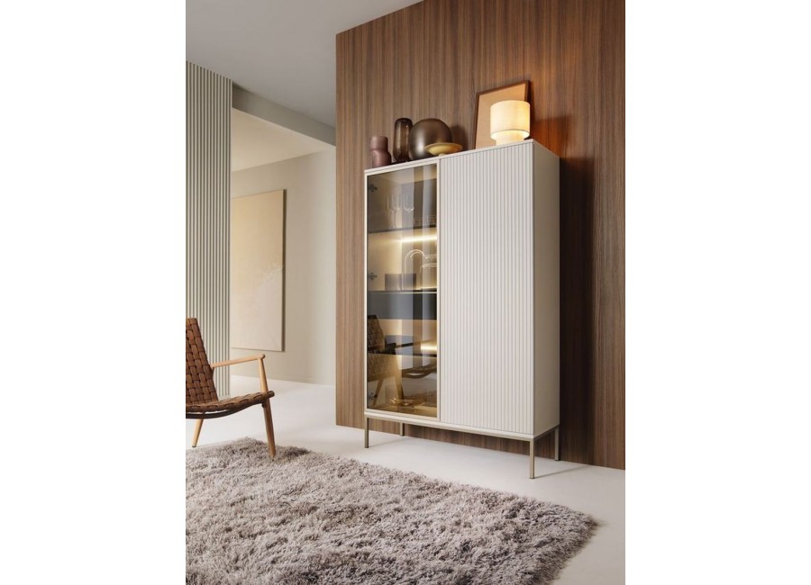 Witryna SENTO WTSZ 104 KASZMIR to mebel, który dzięki frezowanym frontom w ciepłym odcieniu dębu zwieńczonych ciepłą barwą oświetlenia LED tworzy nowoczesny i funkcjonalny design.