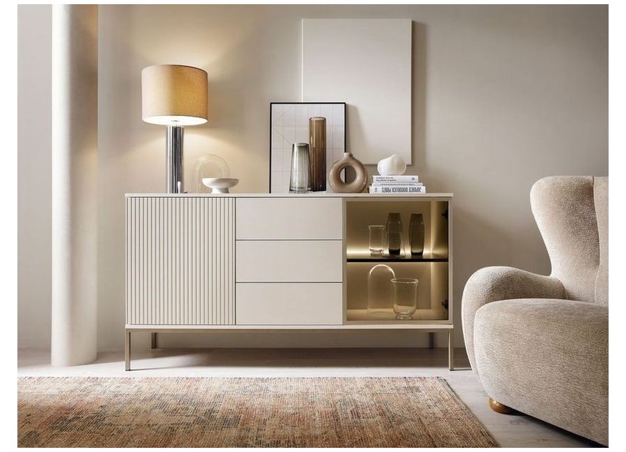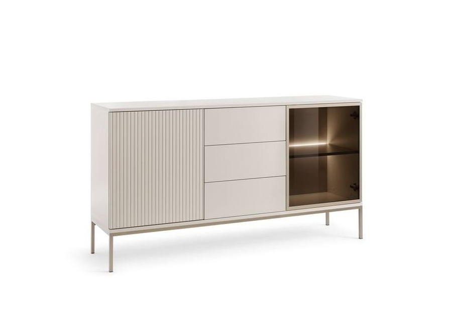 Komoda SENTO KSZ154 KASZMIR to mebel, który dzięki frezowanym frontom w ciepłym odcieniu dębu zwieńczonych ciepłą barwą oświetlenia LED tworzy nowoczesny i funkcjonalny design.
