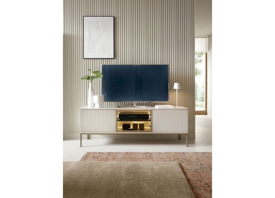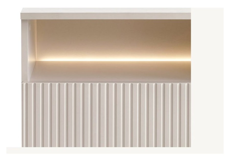RTV SENTO RTV154 KASZMIR to mebel, który dzięki frezowanym frontom w ciepłym odcieniu dębu zwieńczonych ciepłą barwą oświetlenia LED tworzy nowoczesny i funkcjonalny design.