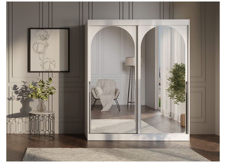 Szafa MODIN to wyjątkowy mebel, który da się dopasować do każdego wnętrza. Jako szafa z drzwiami przesuwnymi pozwala zaoszczędzić sporo cennego miejsca w niewielkich pomieszczeniach. Została wyposażona w lustra, które optycznie powiększają pokój oraz stanowią niebanalną ozdobę.